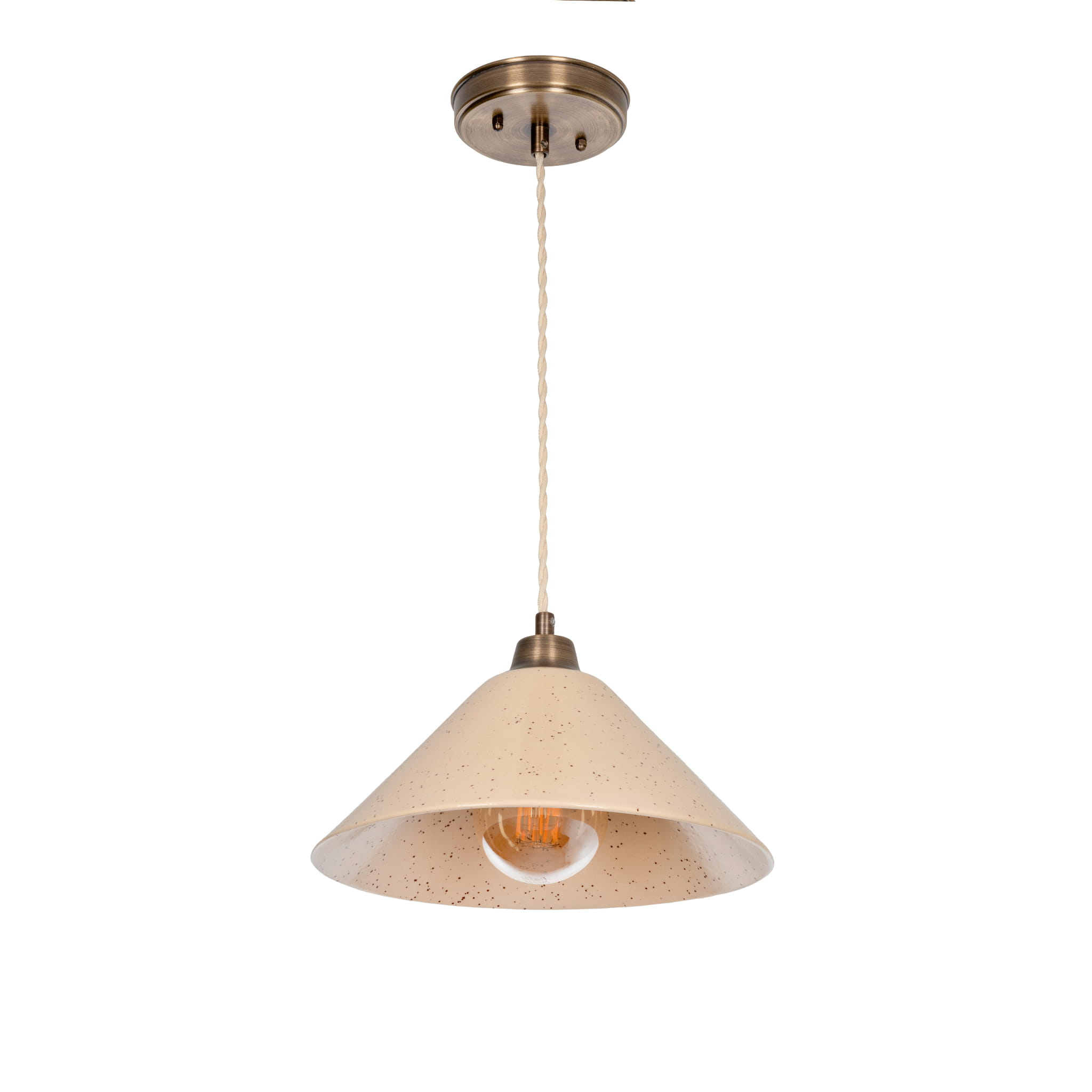 Ozdobny, pleciony sznur w kolorze postarzanego mosiądzu dodaje lampie lekkości i jest eleganckim detalem, podkreślającym jej styl vintage.