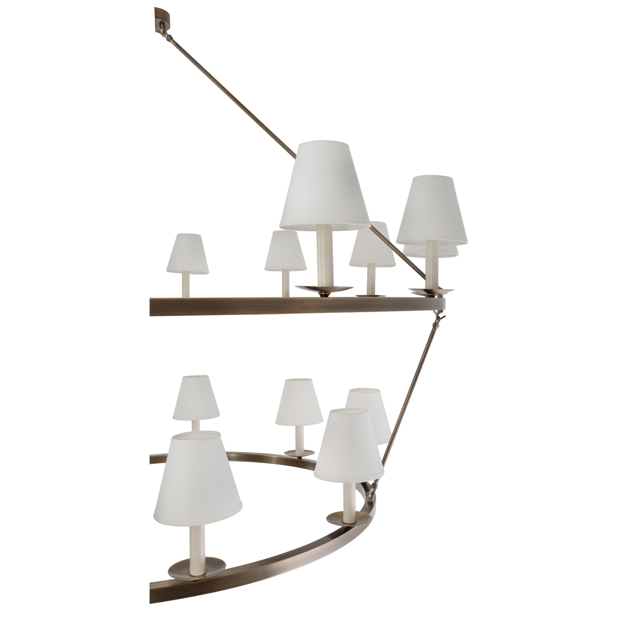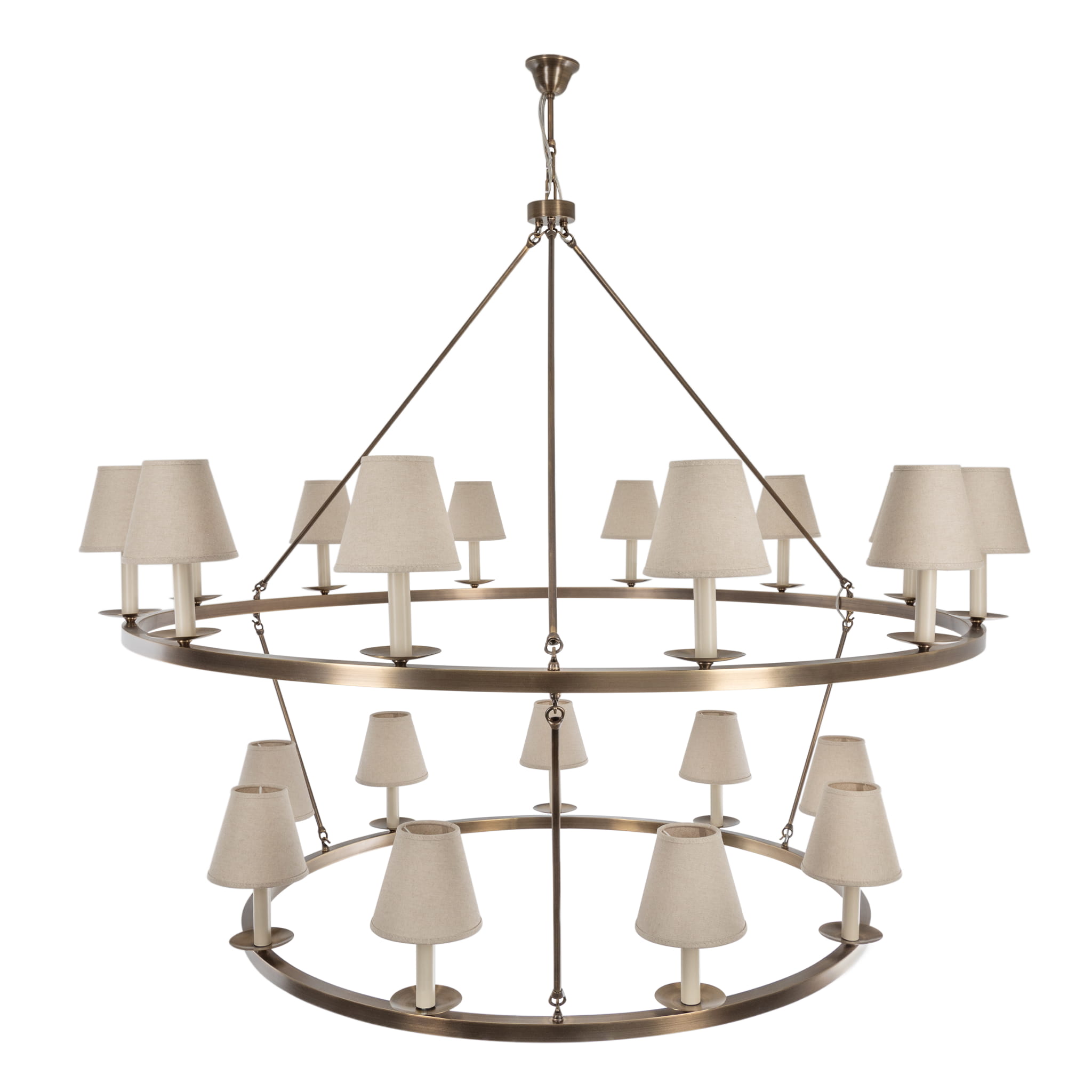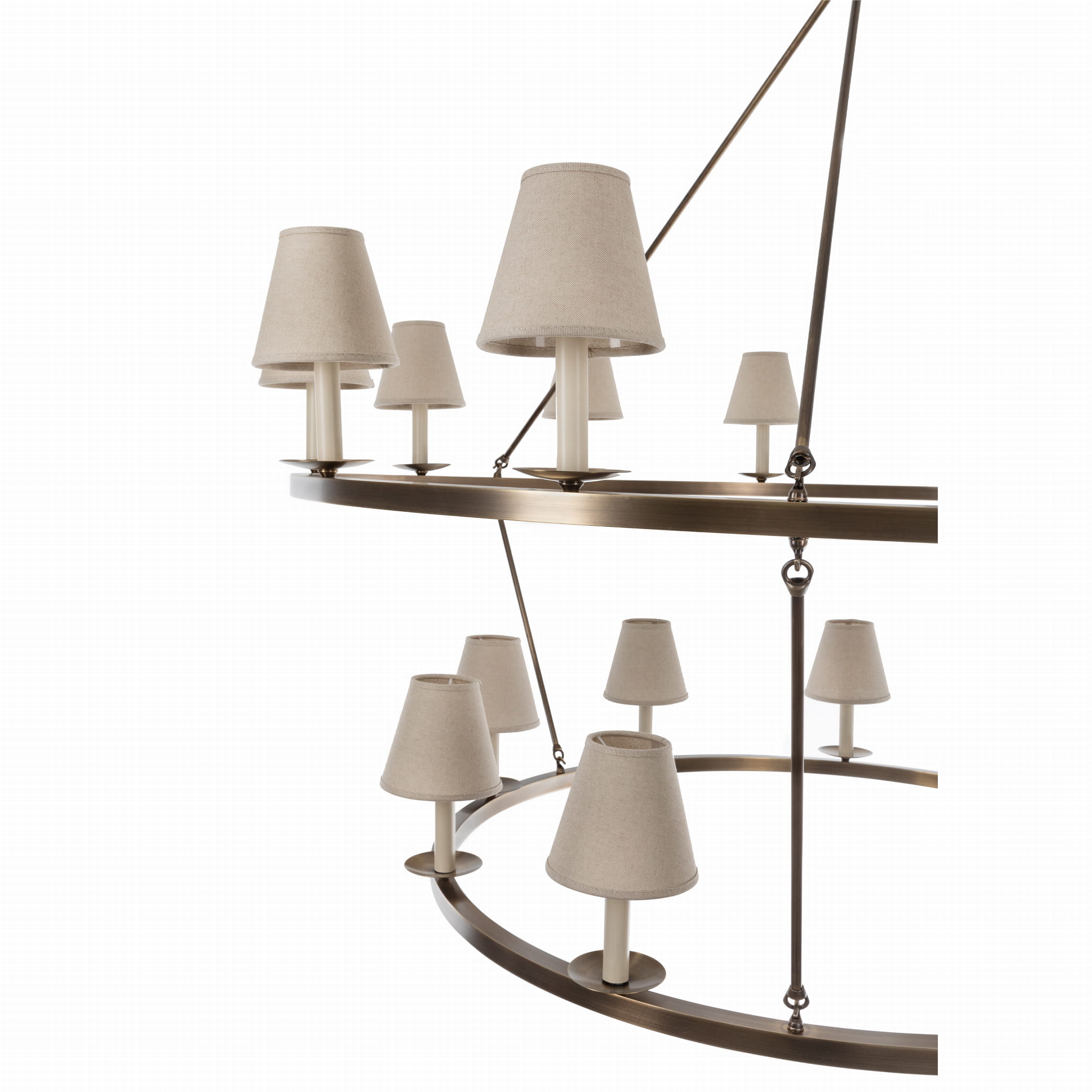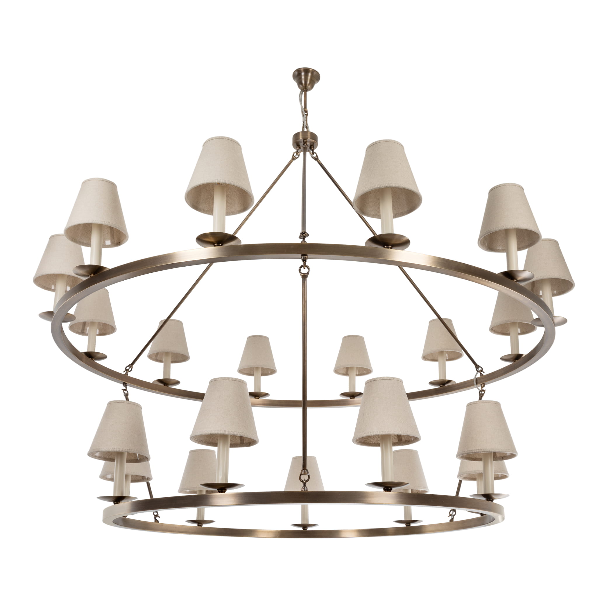 Aurora Double to okazały żyrandol wykonany z wysokiej jakości mosiądzu, który zachwyca architektoniczną konstrukcją i elegancką prostotą. Jego wyjątkowa, dwupoziomowa forma oparta na dwóch koncentrycznych kołach czyni go imponującym elementem dekoracyjnym do wysokich i przestronnych wnętrz.